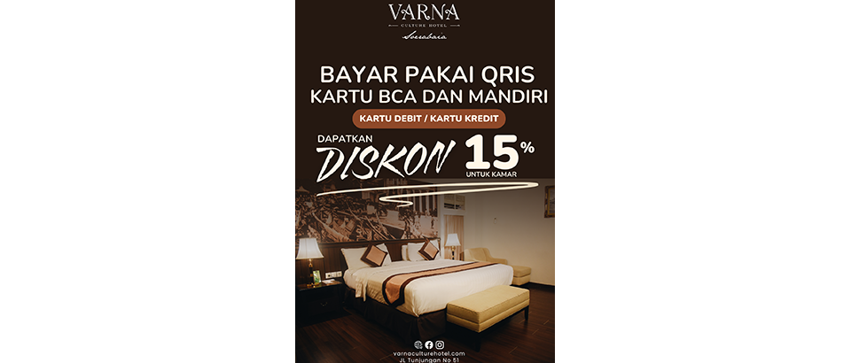Nikmati potongan 15% untuk setiap pemesanan kamar di Hotel Varna Surabaya! , Cukup lakukan pembayaran melalui QRIS BCA atau QRIS Mandiri dan rasakan pengalaman menginap nyaman dalam suasana klasik khas Varna.